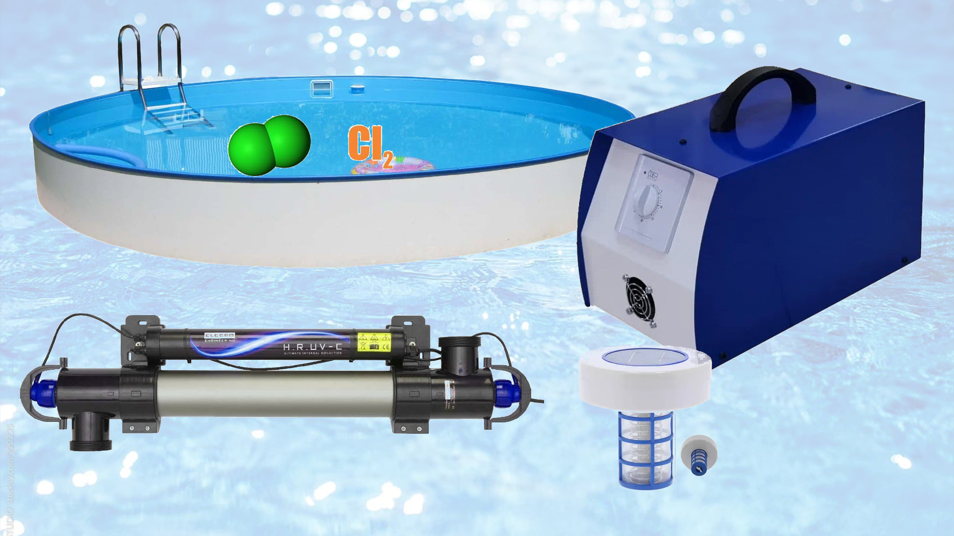 Еще один “безхлорный” метод – это электролиз с выделением ионов серебра и меди. Суть в том, что в поток воды устанавливаются электроды из серебра и медных сплавов; пропуская слабый ток, добиваются растворения очень малых концентраций ионов Ag^+ и Cu^2+ в воду. Издавна известно бактерицидное свойство серебра (серебряные сосуды сохраняли воду свежей), медь же является хорошим альгицидом (убивает водоросли).