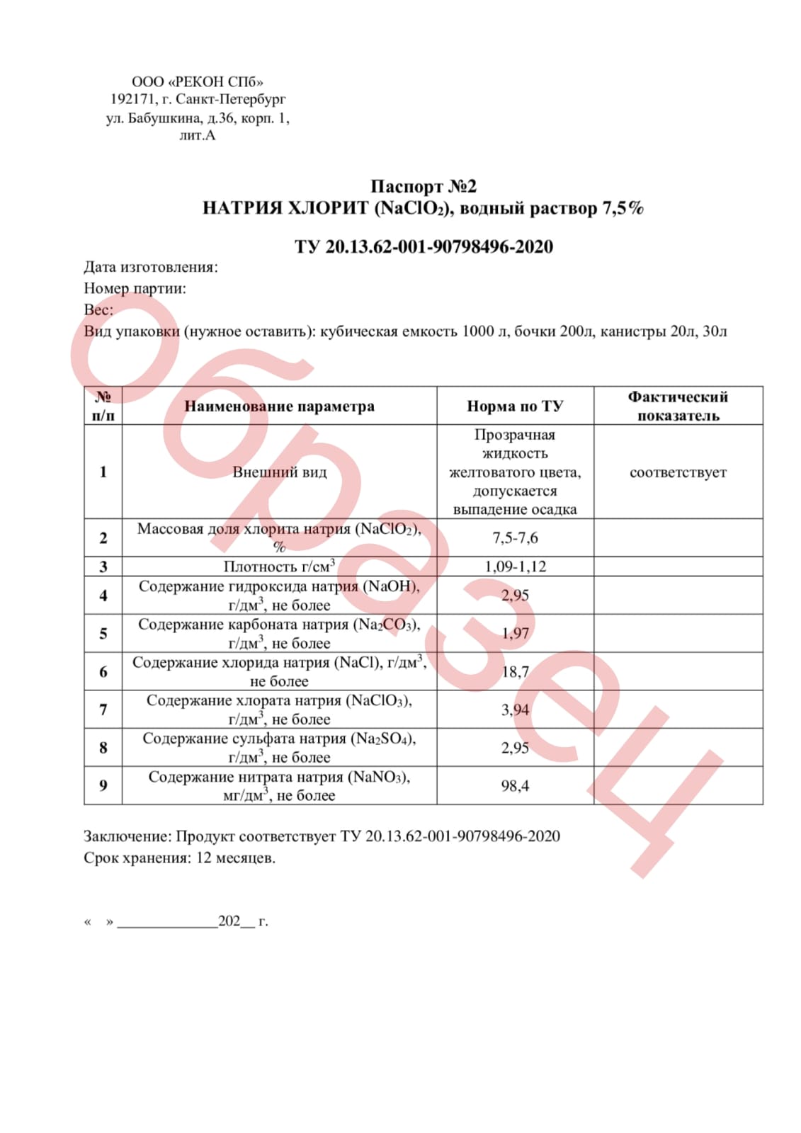 ООО «РЕКОН СПб» предлагает хлорит натрия 7,5 процентов (NaClO₂) высокого качества с доставкой по Санкт-Петербургу и Ленинградской области. Продукт оптимально подходит для промышленного применения — генерации диоксида хлора, дезинфекции и водоподготовки. Раствор обладает стабильными свойствами и безопасен при соблюдении правил использования.
